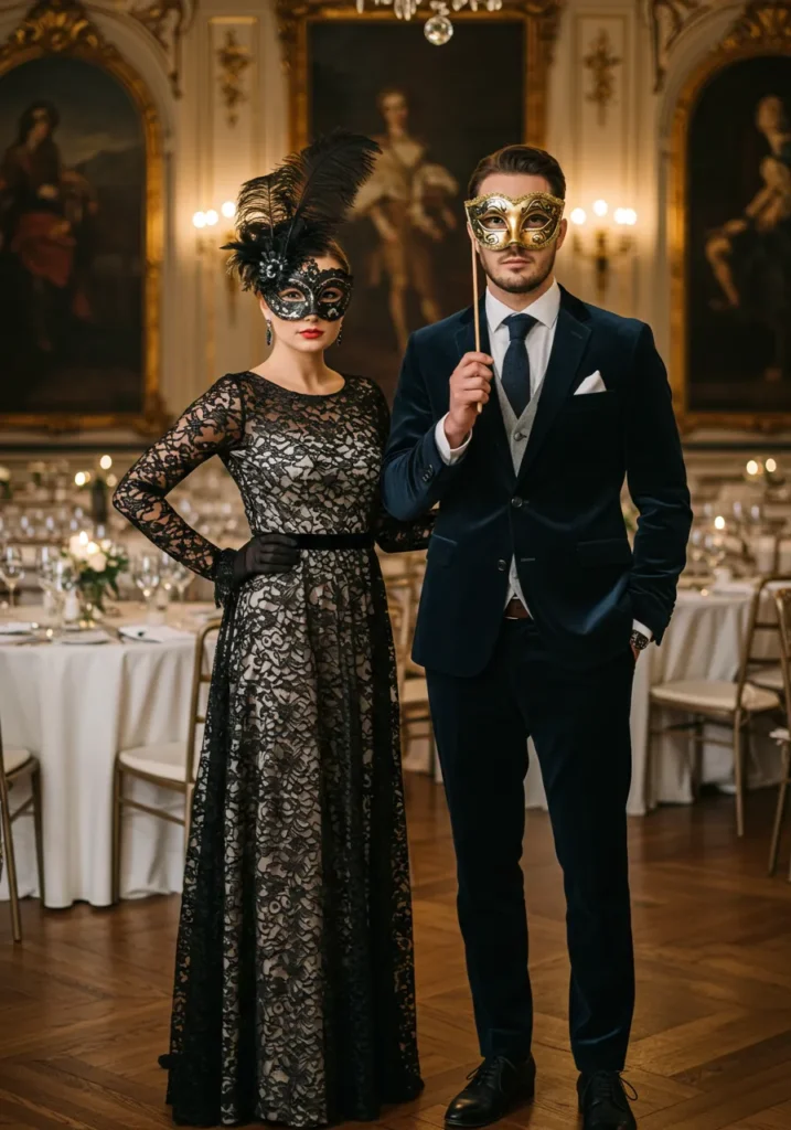Mystery and elegance in one look. Gowns, velvet suits, and ornate masks create an enchanting atmosphere.