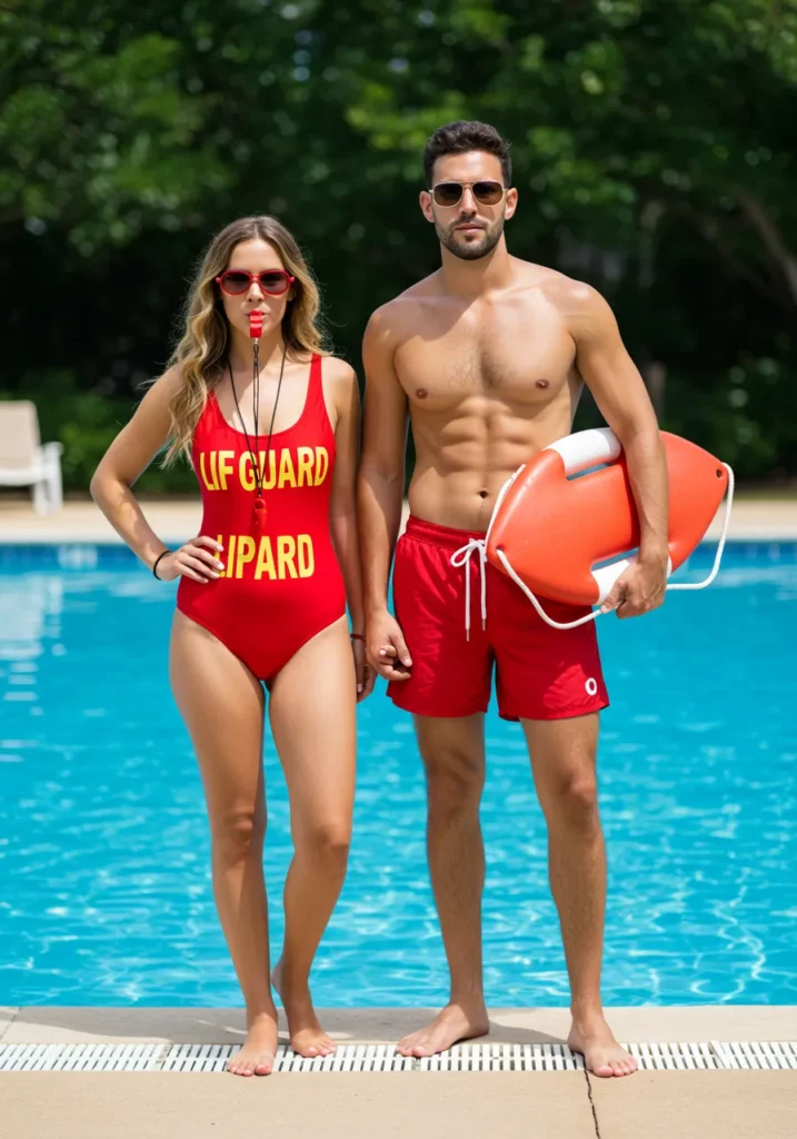 Simple, sporty, and instantly recognizable. Red swimwear, sunglasses, and whistles complete the look.
