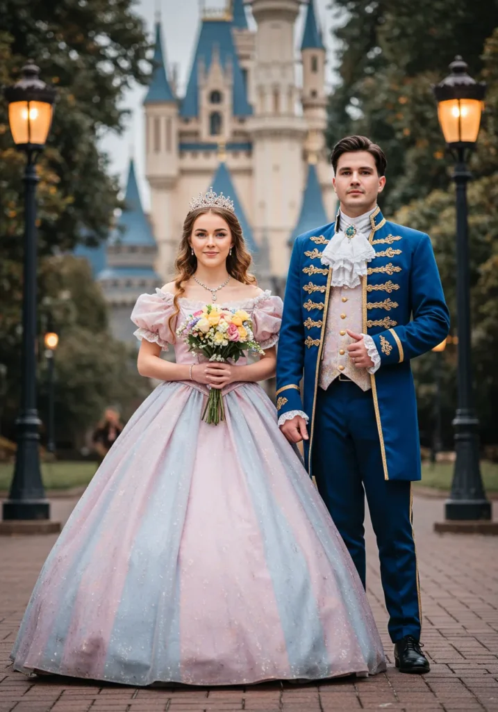 Transform into a storybook pair. Think pastel gowns, tiaras, and embroidered suits fit for a castle.