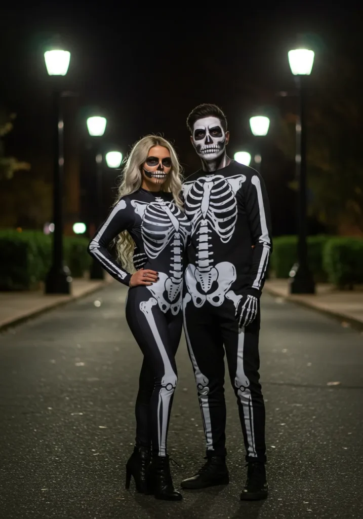 A timeless Halloween classic with a modern edge. This couple rocks full-body skeleton jumpsuits with white bone detailing from head to toe. Face paint completes the illusion, while her heeled boots and flowing hair add a chic twist.
