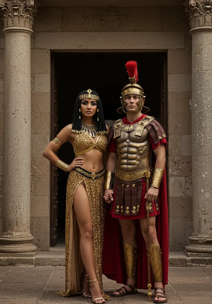A regal pairing that radiates power and elegance. She dazzles in gold with dramatic Egyptian jewelry, while he commands attention in Roman armor and a red cape.
