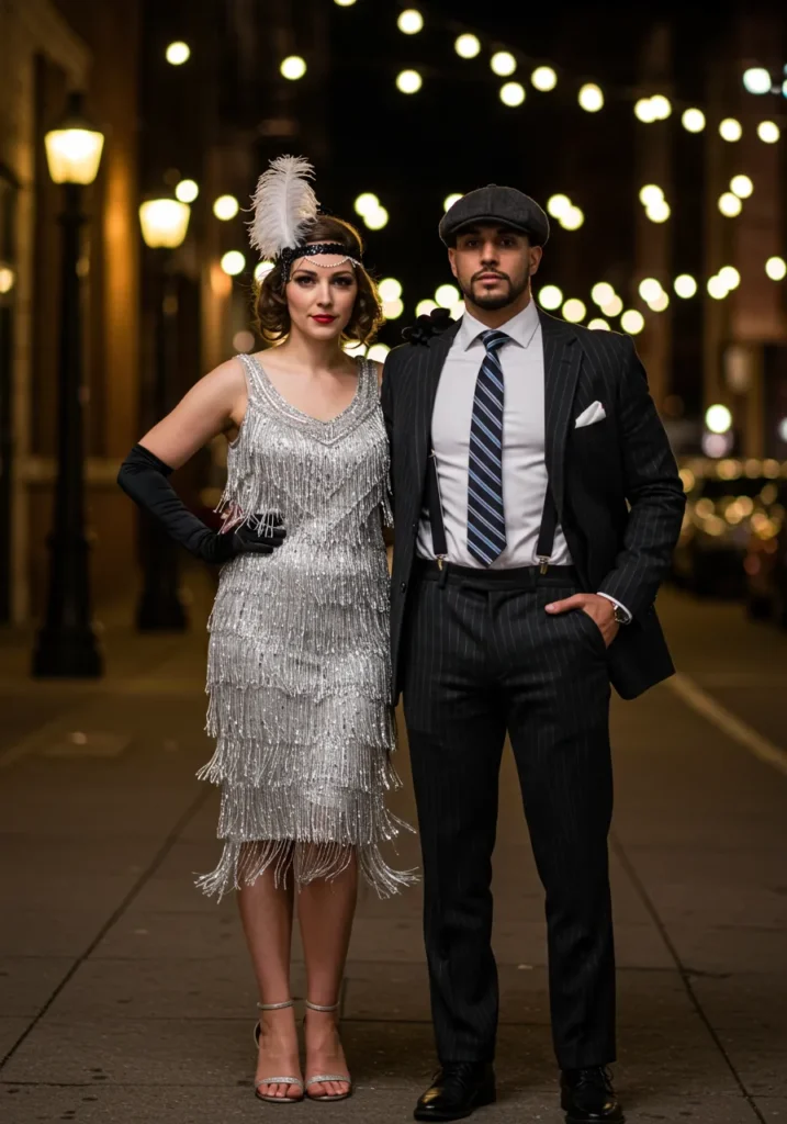 Step back into the Roaring Twenties. She sparkles in a silver fringe dress and feathered headband; he complements her in a pinstripe suit and suspenders.