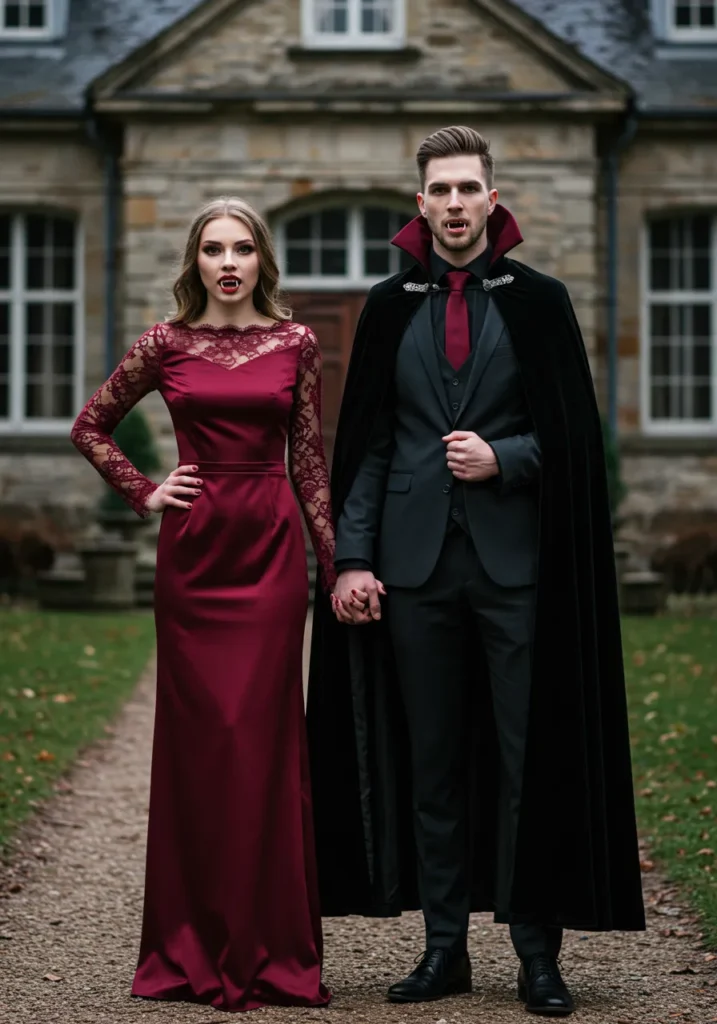 Dark romance done right. She wears a burgundy lace gown; he’s mysterious in a black suit and cape. Matching fangs seal the deal.