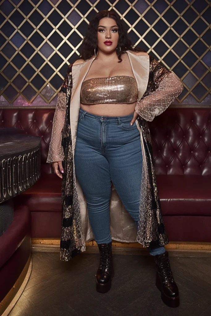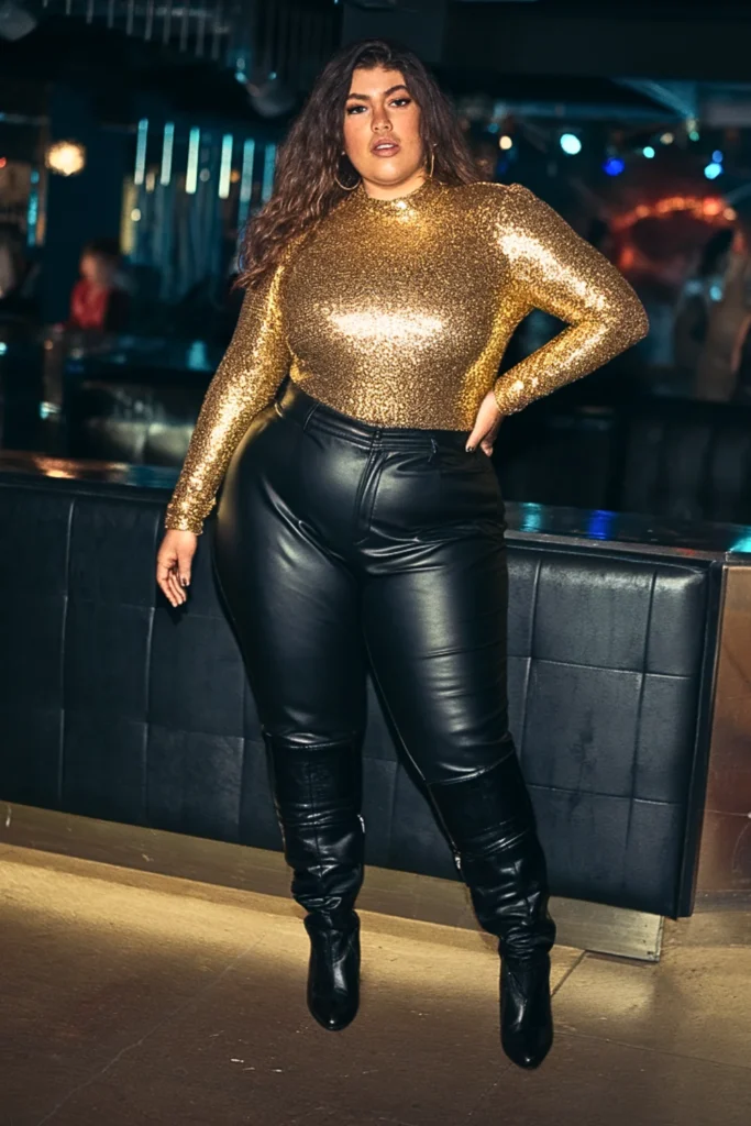 A long-sleeve sequined bodysuit catches every light on the dance floor while hugging your curves. Pair it with black leather pants and knee-high boots for warmth. Add a cropped faux fur jacket for luxe vibes between venues.