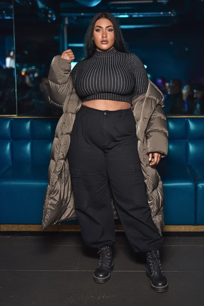 A ribbed turtleneck crop adds warmth while showing just enough skin. High-waisted cargo pants and combat boots bring that urban edge.