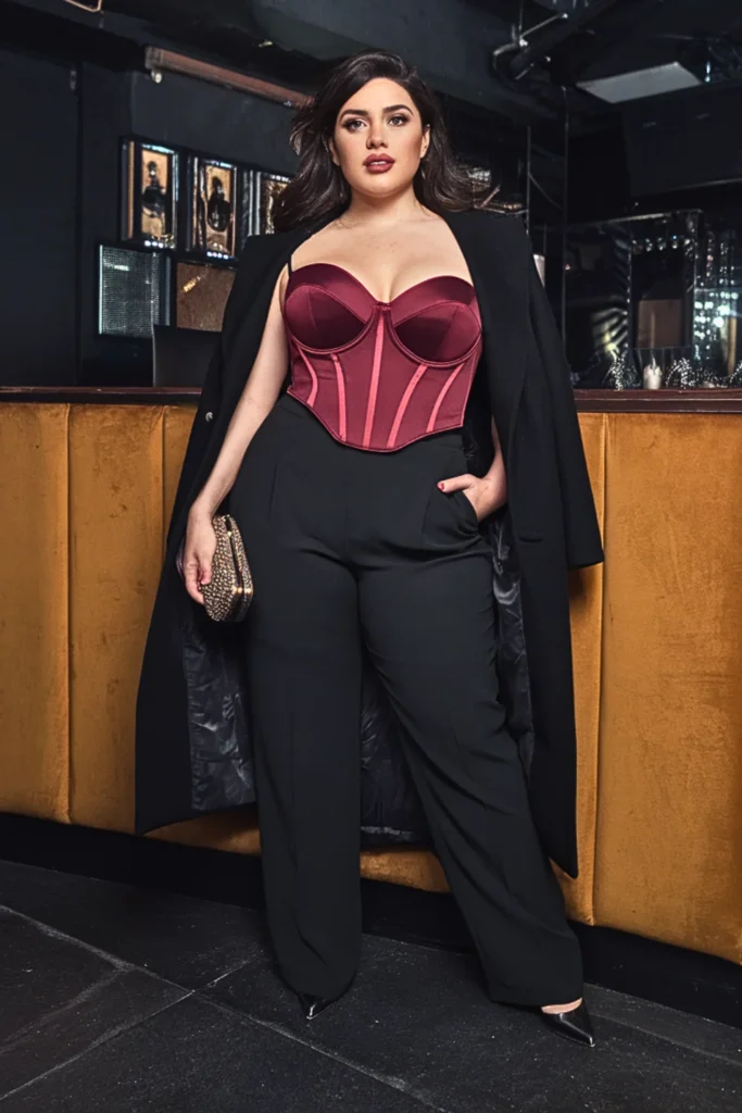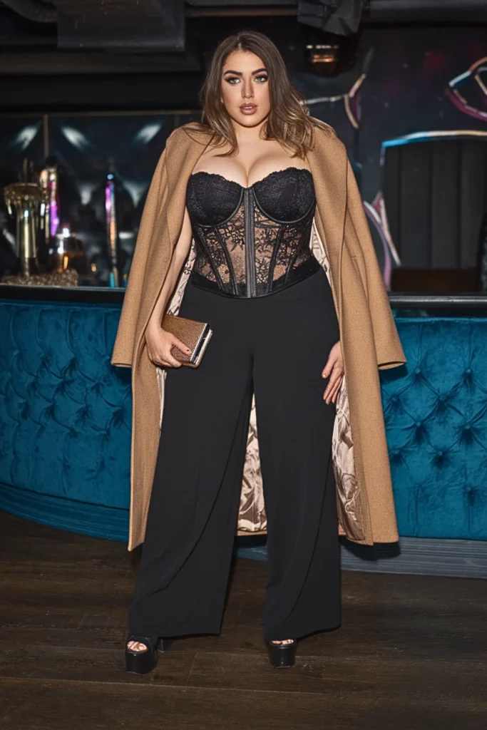 A lace corset creates that dreamy hourglass shape while wide-leg pants keep things elegant. Add a long coat, platform heels, and a sleek clutch.