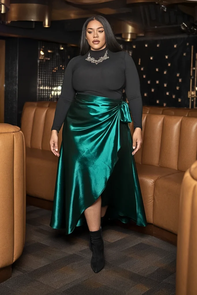An emerald satin wrap skirt reflects the light beautifully. Add ankle boots and a statement necklace for classy club vibes.