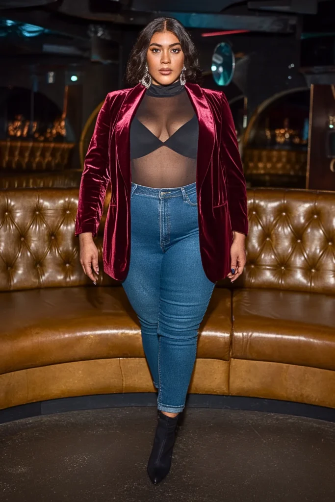 A deep burgundy velvet blazer layered over a black mesh bodysuit is pure power dressing. High-waisted jeans and pointed-toe ankle boots finish the look—perfect for dinner and the club.