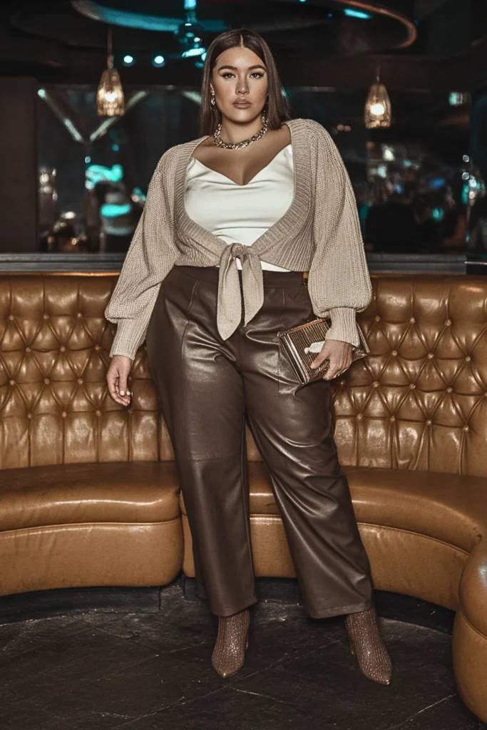- Tie-Front Cardigan + Leather Pants: Layer a cropped cardigan over a fitted cami for a cozy-yet-sexy combo.