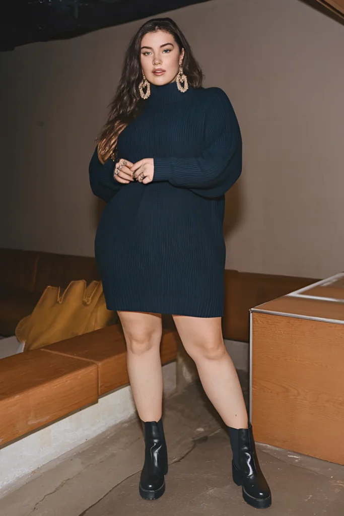 - Teal Ribbed Sweater Dress: A body-hugging turtleneck sweater dress with black ankle boots is effortless winter chic.
