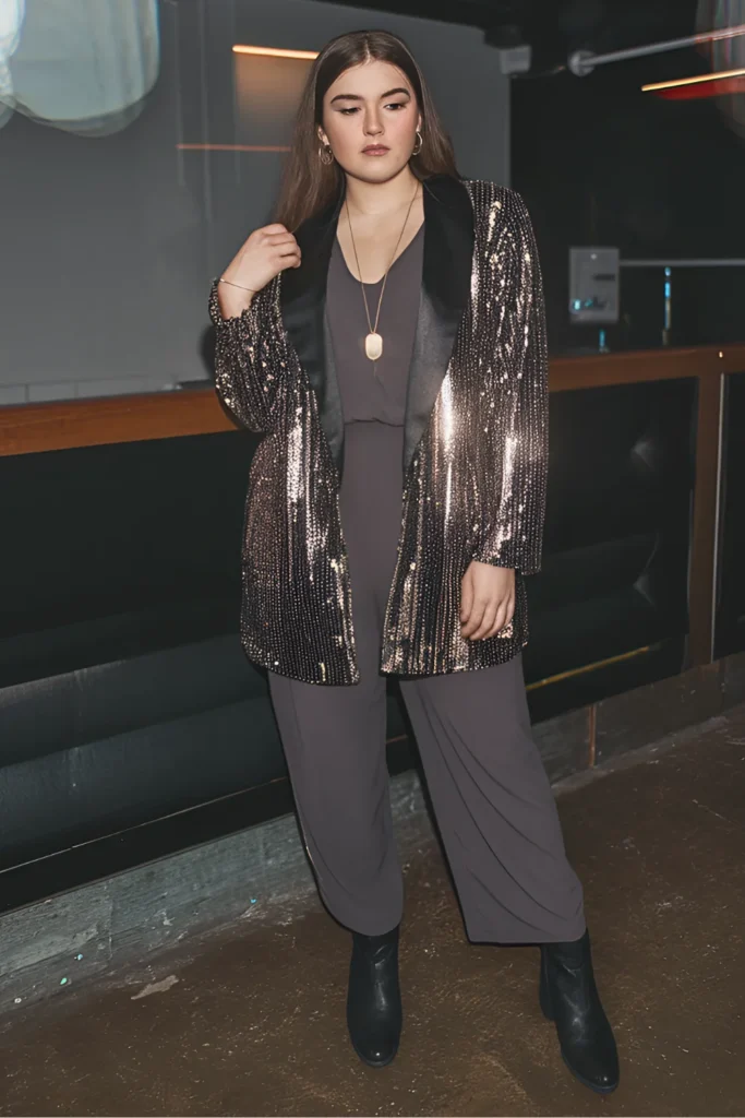 - Bronze Sequined Blazer + Jumpsuit: Throw a sequined blazer over a simple jumpsuit for instant party-ready shine.