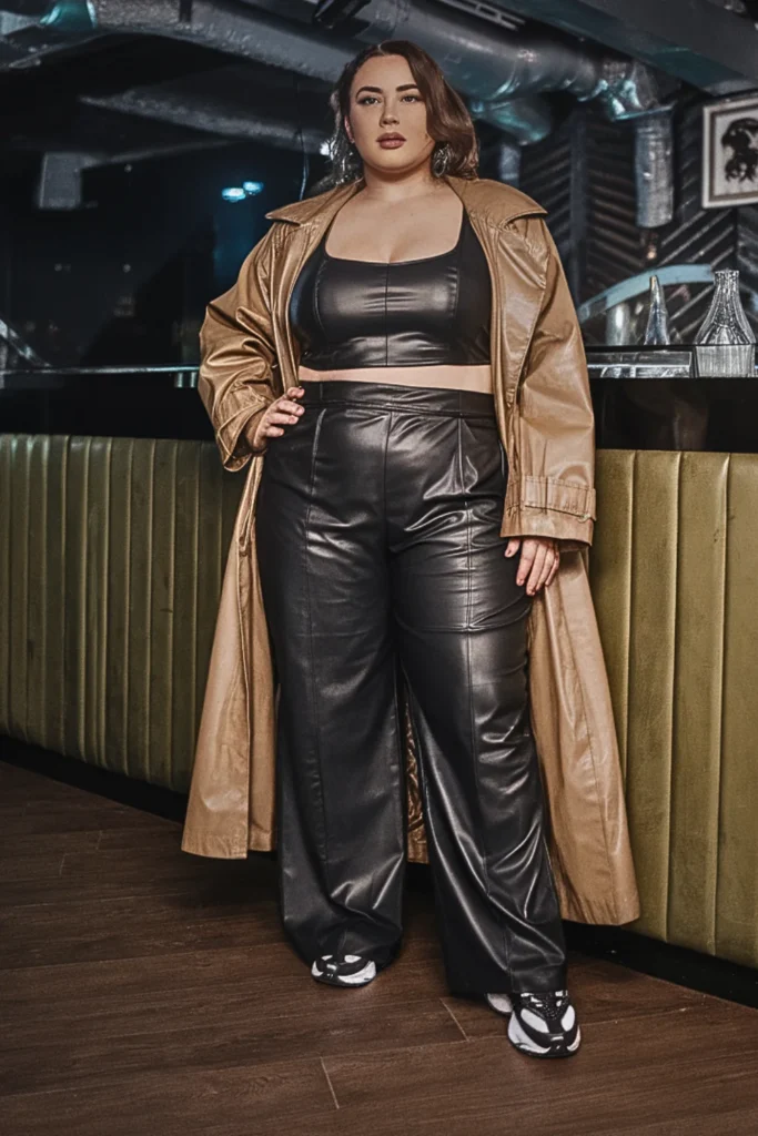 A black leather crop top with high-waisted trousers delivers that baddie energy. Add a long trench coat and chunky sneakers for an edgy-meets-elegant vibe.
