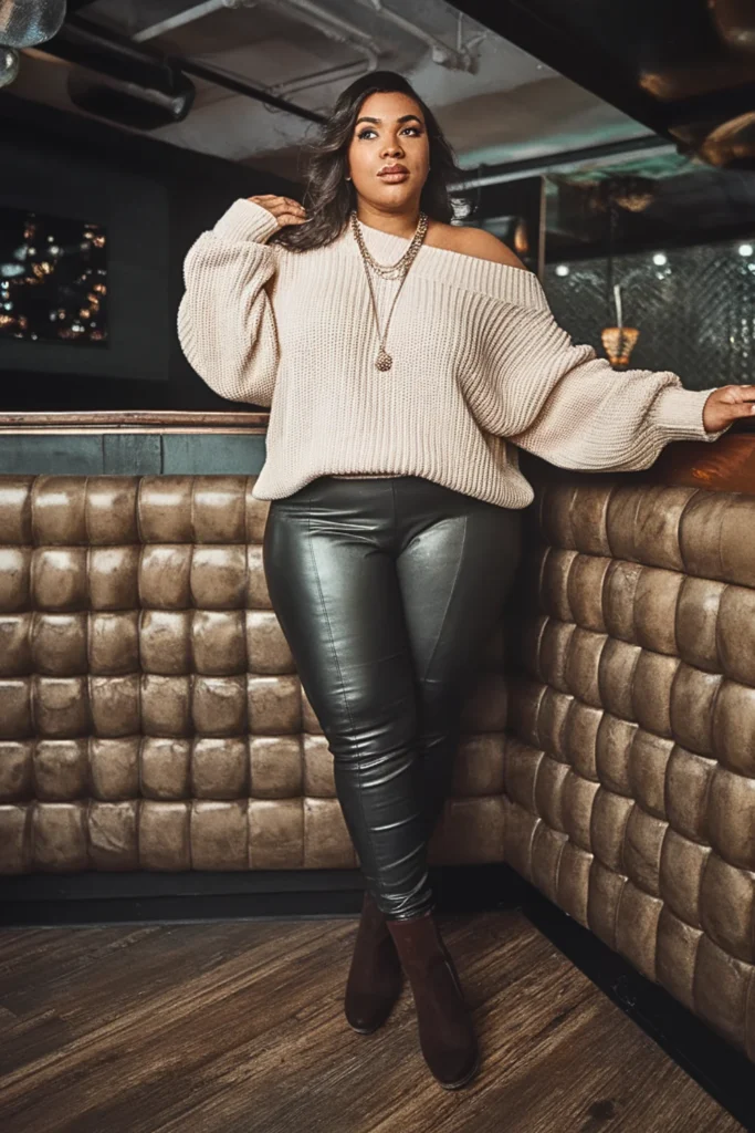 Cozy meets sexy. A cream off-shoulder sweater paired with leather leggings and ankle boots proves comfort can still be hot.