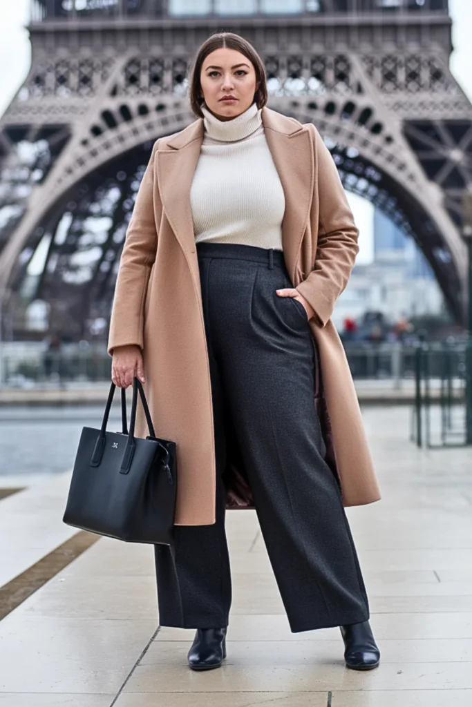 Own the Parisian streets in a tailored camel wool coat paired with high-waisted charcoal trousers. Add a cream turtleneck for warmth and black ankle boots for polish. A structured tote completes the timeless, sophisticated vibe.