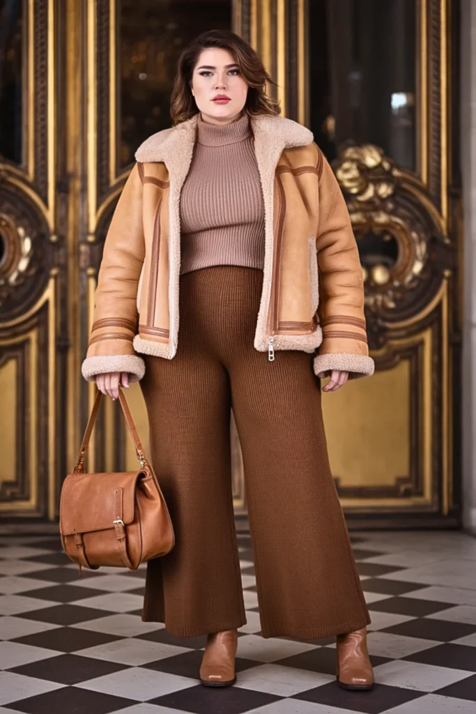 Pair a tan shearling aviator jacket with chocolate knit pants and an oatmeal sweater. Tan boots and a brown messenger bag finish this luxe, textural outfit.