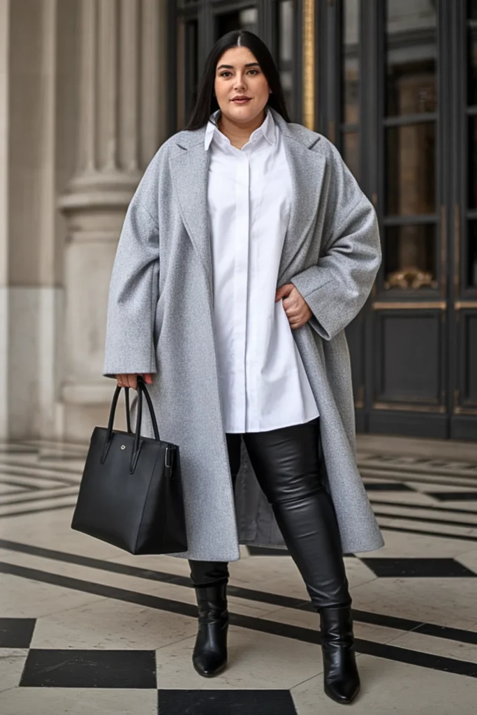 Balance volume and sleekness with a gray oversized coat and black leather leggings. Layer a crisp white shirt underneath for contrast — modern minimalism at its best.