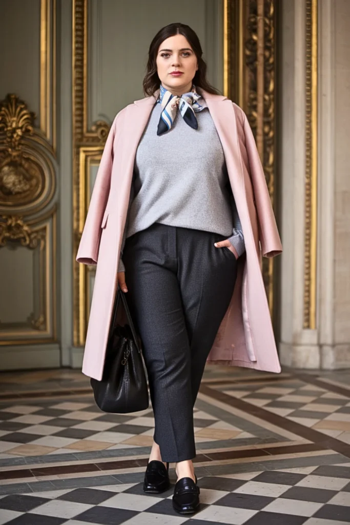 A great coat is your foundation. Choose one that buttons comfortably and defines your shape — not one that just “almost” fits. Structure equals instant polish.