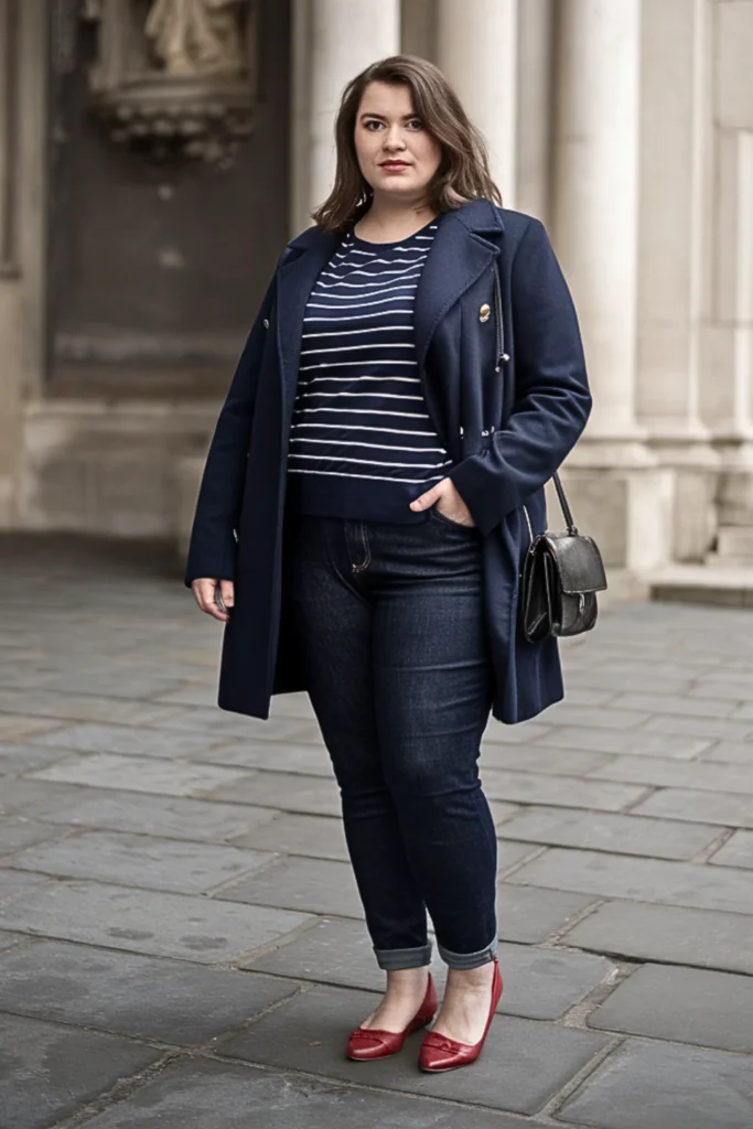 You can’t go wrong with a navy peacoat and Breton striped top. Add dark jeans, red ballet flats, and a crossbody bag for a classic French-girl touch.