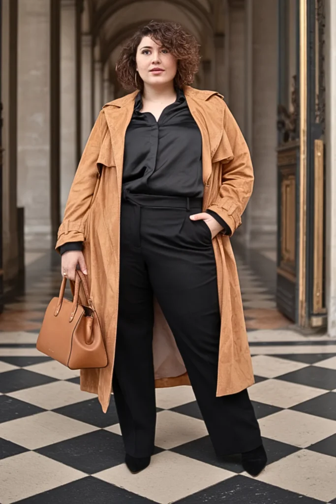 Go luxe in a caramel suede trench layered over black slim trousers and a silk blouse. Add heeled boots and a matching handbag — understated but striking.