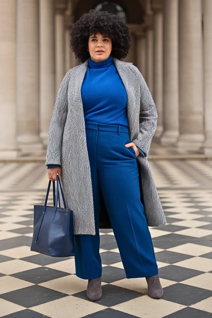 Pair a gray herringbone coat with sapphire blue trousers and a matching turtleneck. Finish with gray ankle boots and a navy tote for a rich, polished look.