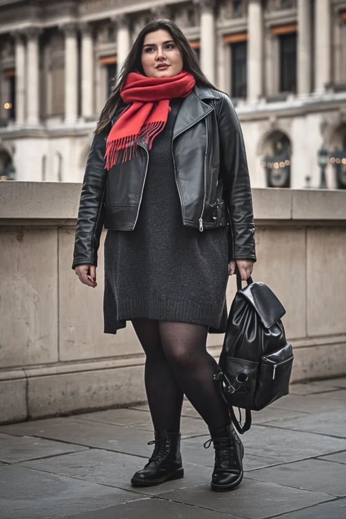 Tough meets soft: a black leather jacket over a charcoal sweater dress. Add fleece tights, combat boots, and a red scarf for attitude and warmth.
