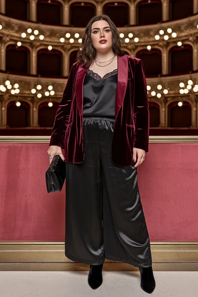 Turn heads in a burgundy velvet blazer over black satin palazzo pants. Add velvet booties, a clutch, and gold jewelry — perfect for winter nights out.