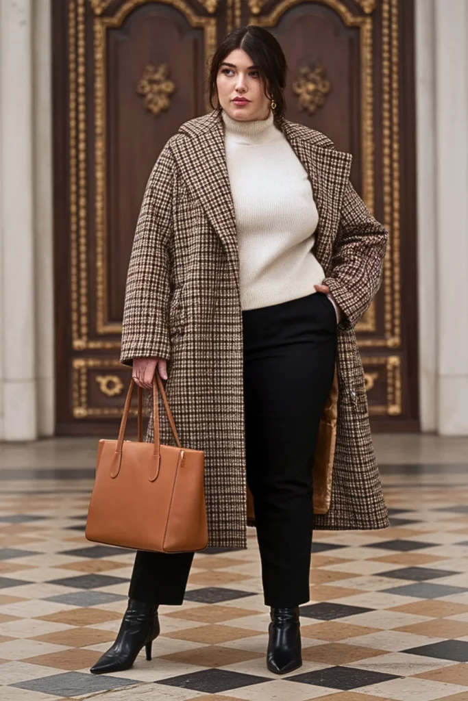 Finish strong with a brown checked wool coat over slim black pants and a cream sweater. Add pointed boots and a brown tote — timeless and endlessly flattering.