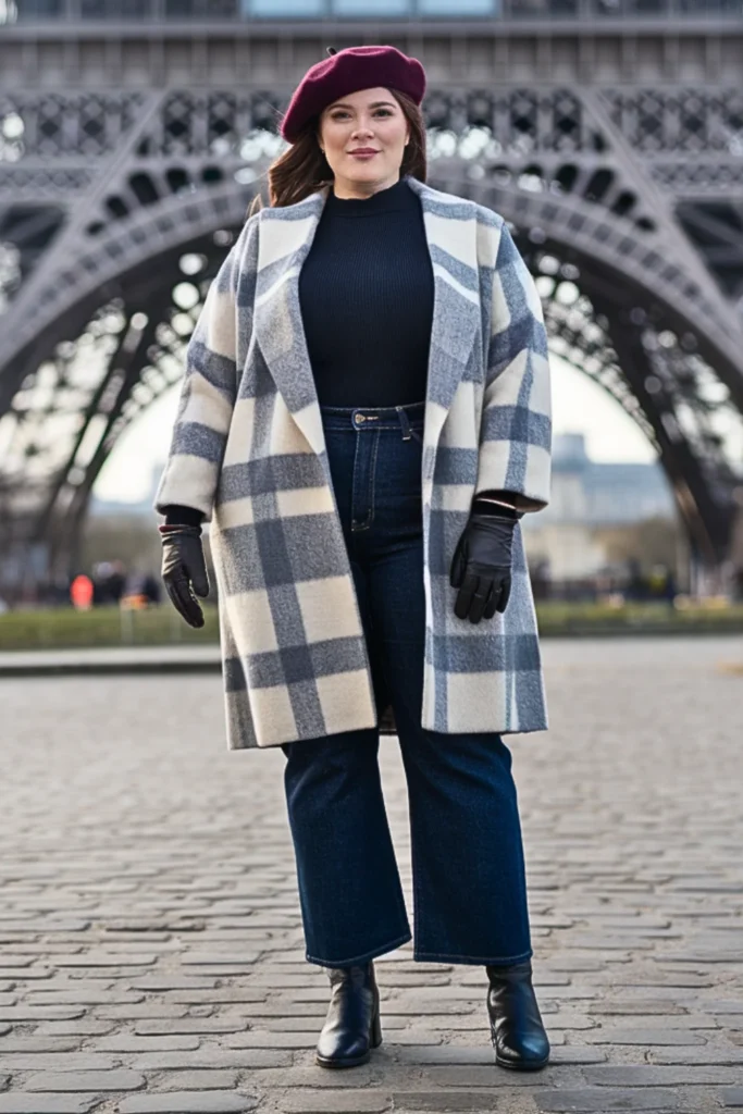 Pattern done right — a gray plaid coat paired with dark denim and a black mock-neck sweater. Add Chelsea boots and a burgundy beret for that subtle “touriste, but make it chic” energy.