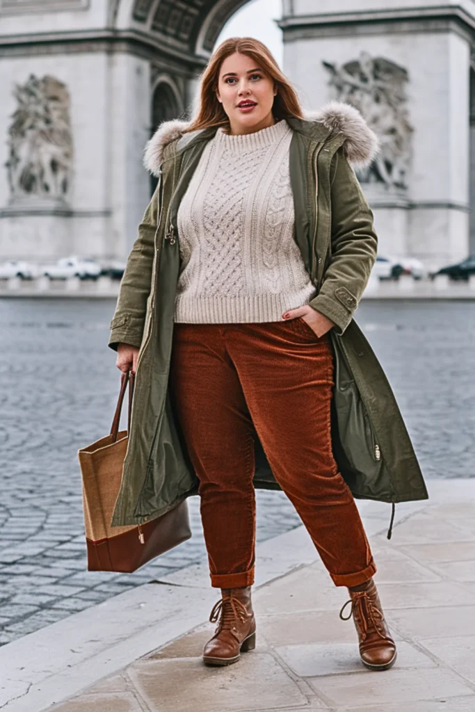 For a casual day, wear an olive parka with rust corduroy trousers and a cream cable-knit sweater. Lace-up brown boots complete this cozy market-day look.