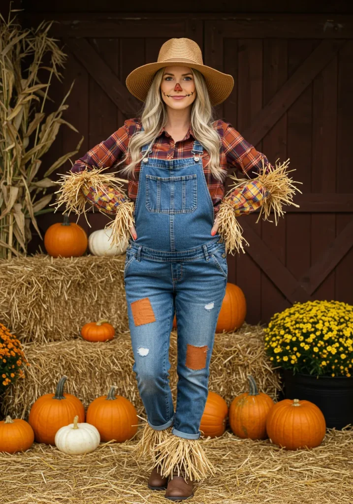 Comfy and cute, this look pairs denim overalls with a plaid shirt and straw accents. Add a floppy hat and face paint for instant farmhouse vibes.