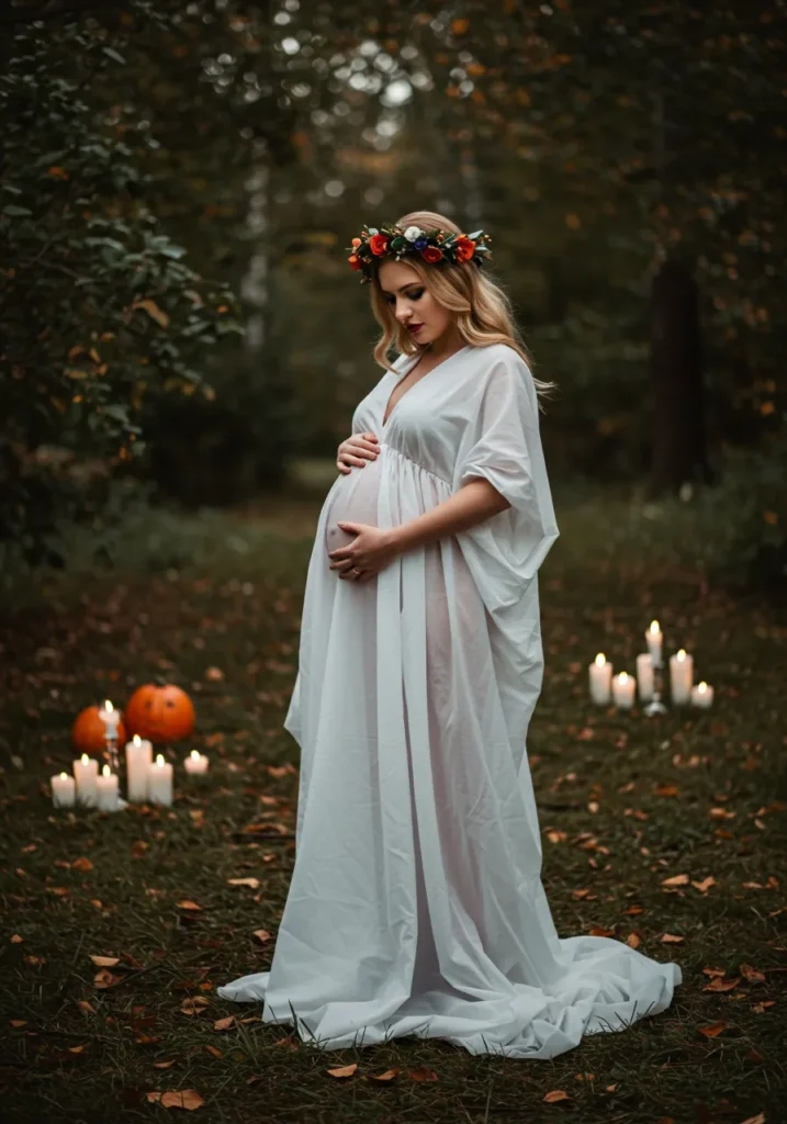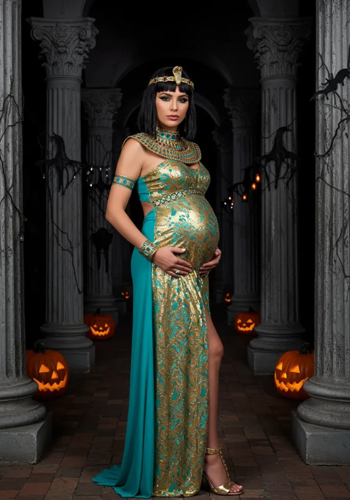 A flowing gold gown with a dramatic cape and leaf crown transforms pregnancy into pure power and elegance. This regal look glows under candlelight or sunset—perfect for a divine Halloween entrance.