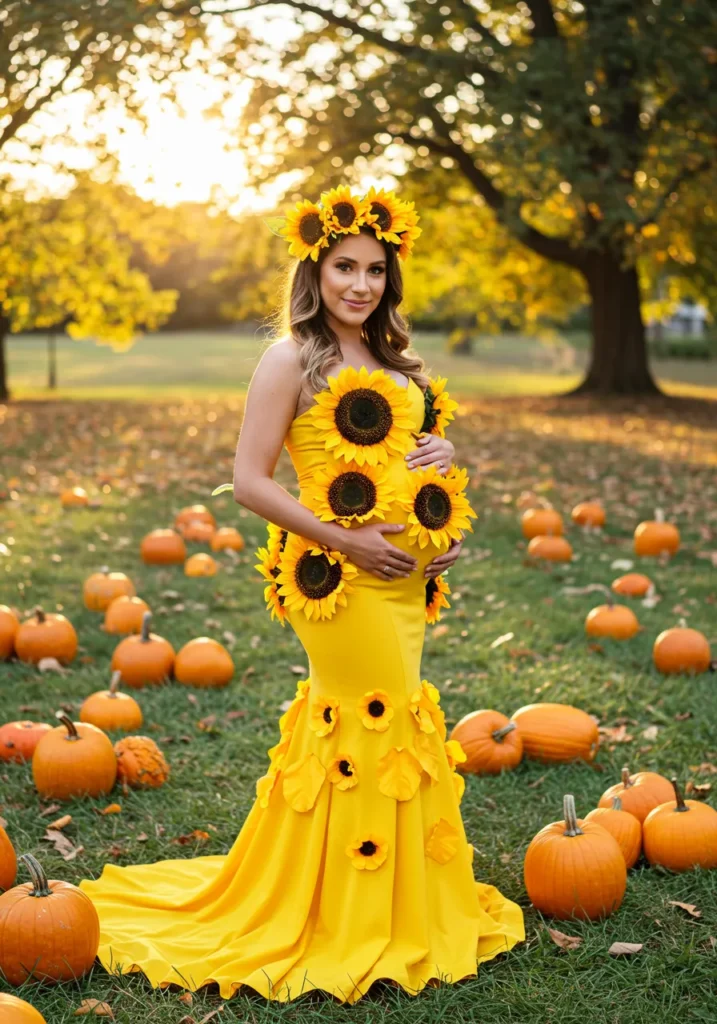 A bright yellow gown covered in sunflowers radiates joy. Pair it with a matching crown for a costume that’s as cheerful as it is stunning.