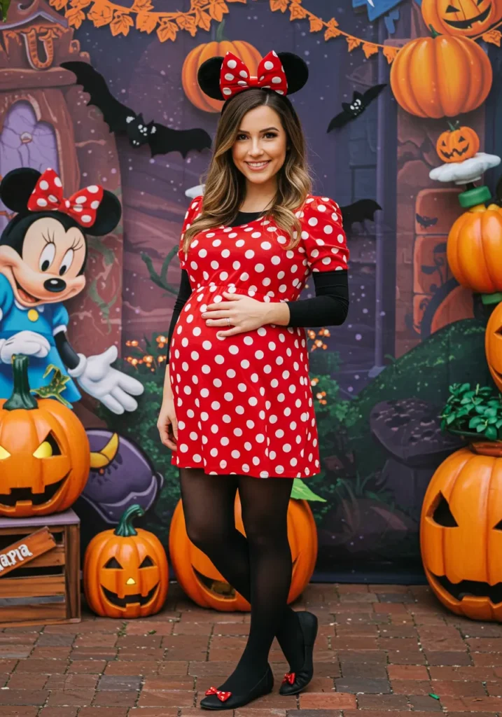 The red polka-dot dress, mouse ears, and bow make this costume timelessly cute. It’s comfortable, fun, and perfect for moms-to-be who love Disney magic.