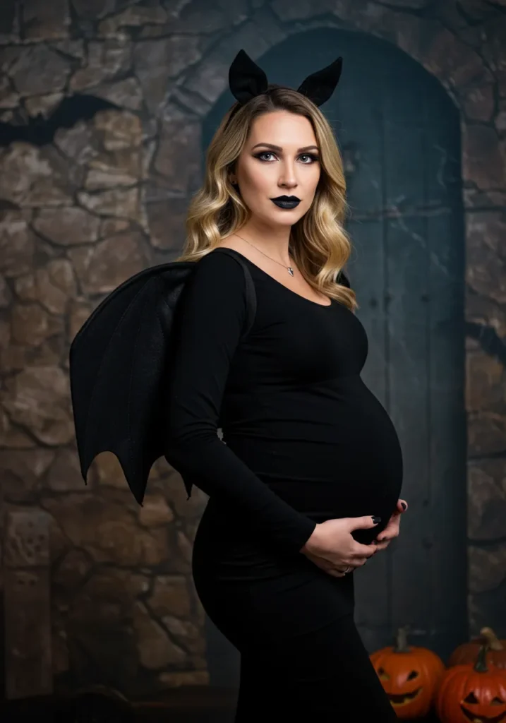 For a mysterious, modern look, wear a sleek black dress with bat wings and bold makeup. It’s edgy, chic, and made for dramatic photos.