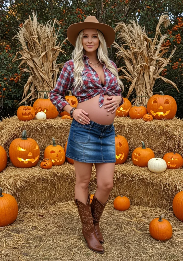 Denim skirt, plaid shirt, cowboy boots, and a wide-brimmed hat — this comfy, flirty outfit is perfect for a fall festival or pumpkin patch party.