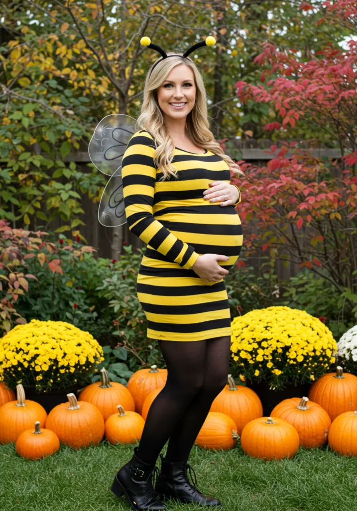 A striped yellow-and-black dress with wings and antennae gives this look cheerful charm. It’s lighthearted, easy to wear, and absolutely bump-flattering.