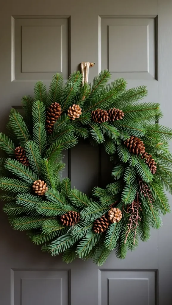 A full, fresh pine wreath on your front door instantly sets the tone. Gather thick pine boughs and secure them to a sturdy circular frame. Instead of plastic accents, decorate with dried berries and small pinecones to keep the focus on lush greenery. The fresh forest scent alone is worth it.