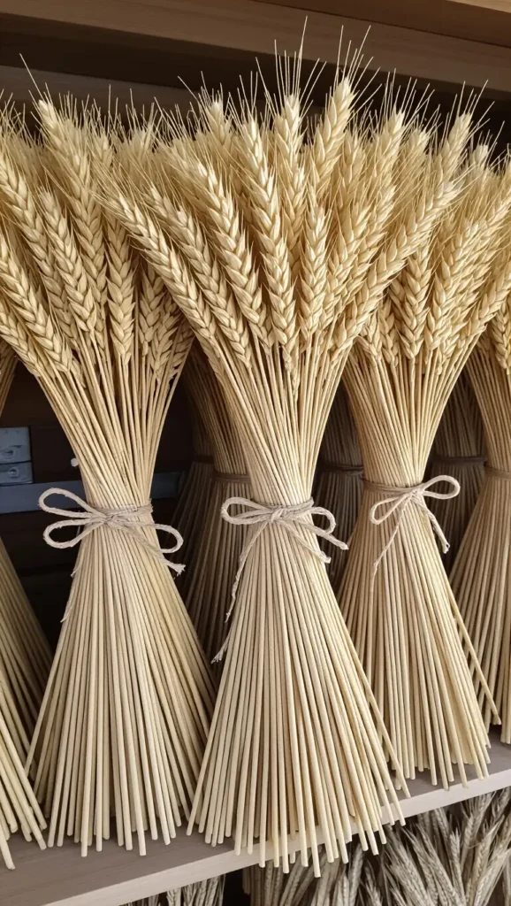 Tie dried wheat sheaves with natural twine and place them around your home. They add height, texture, and a golden farmhouse feel reminiscent of harvest season.