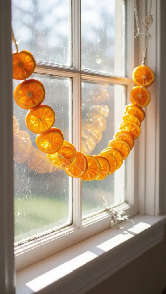 Cut orange peels into shapes or segments and let them dry completely. String them together and hang near windows. The vibrant color and citrus scent make this garland especially cheerful.