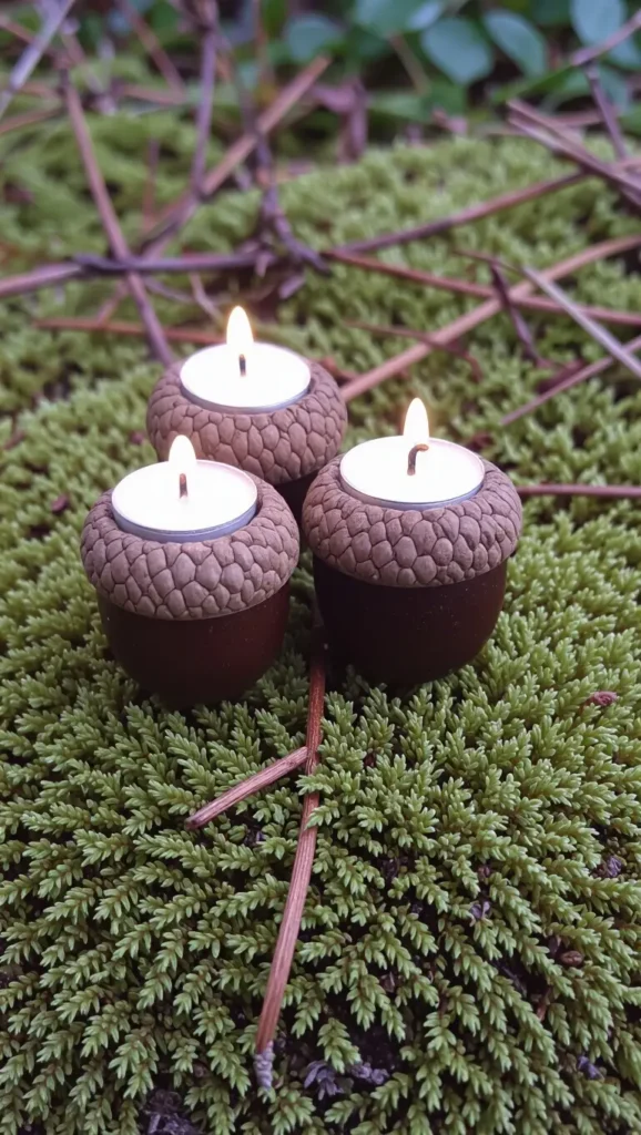 Clean large acorn caps and place mini tea lights inside. Arrange them on moss for a tiny, enchanting nature display that adds soft, low-level lighting.