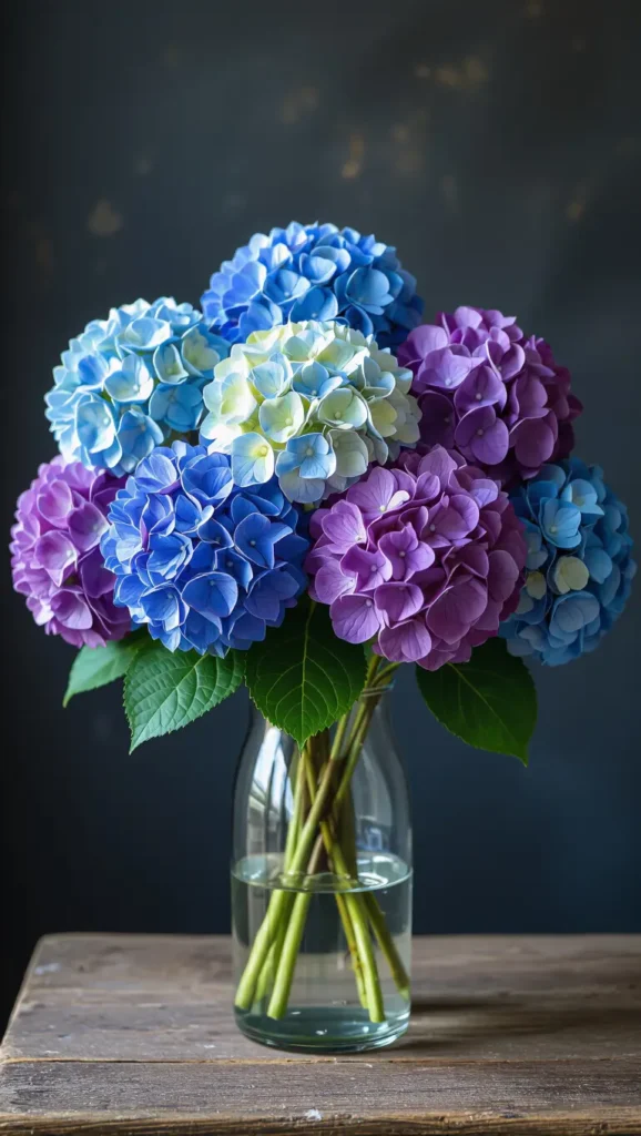 Use dried hydrangea blooms in muted blues, greens, and purples. Display them in glass vases or rustic pitchers for a soft, vintage holiday touch.