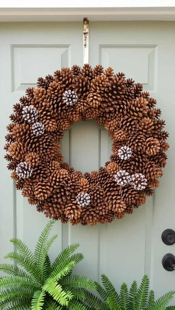 Create a bold wreath using only pinecones in various sizes. Overlap and secure them tightly for a dramatic, texture-rich design that makes a strong natural statement.