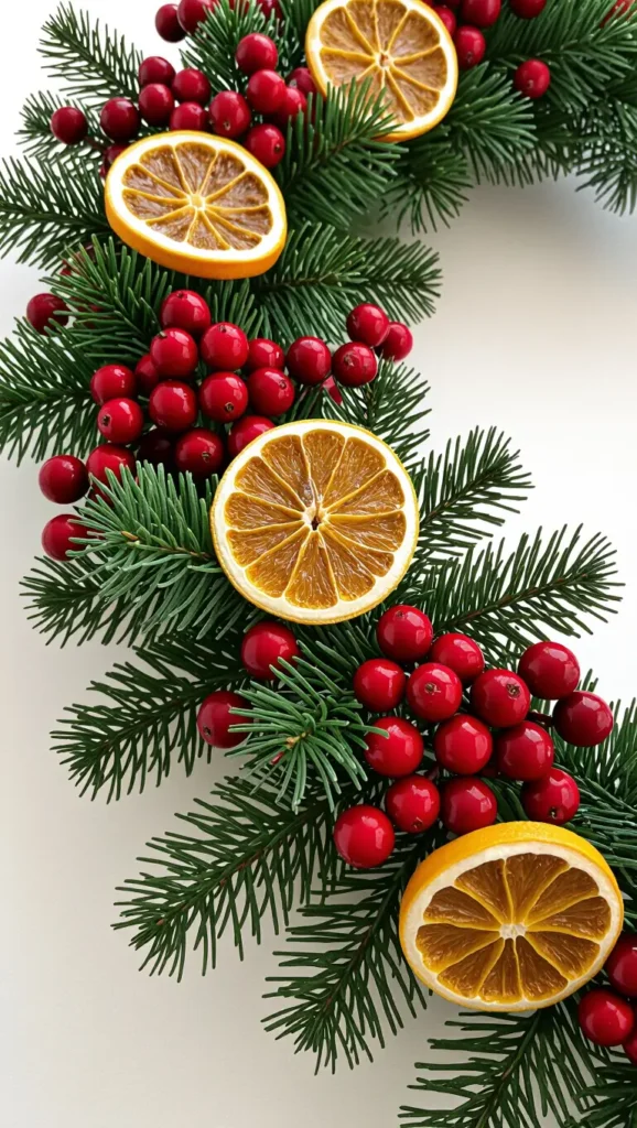 Combine bright cranberries with dried orange slices for a classic, cheerful garland. Hang it across doorways or shelves to instantly brighten the room.
