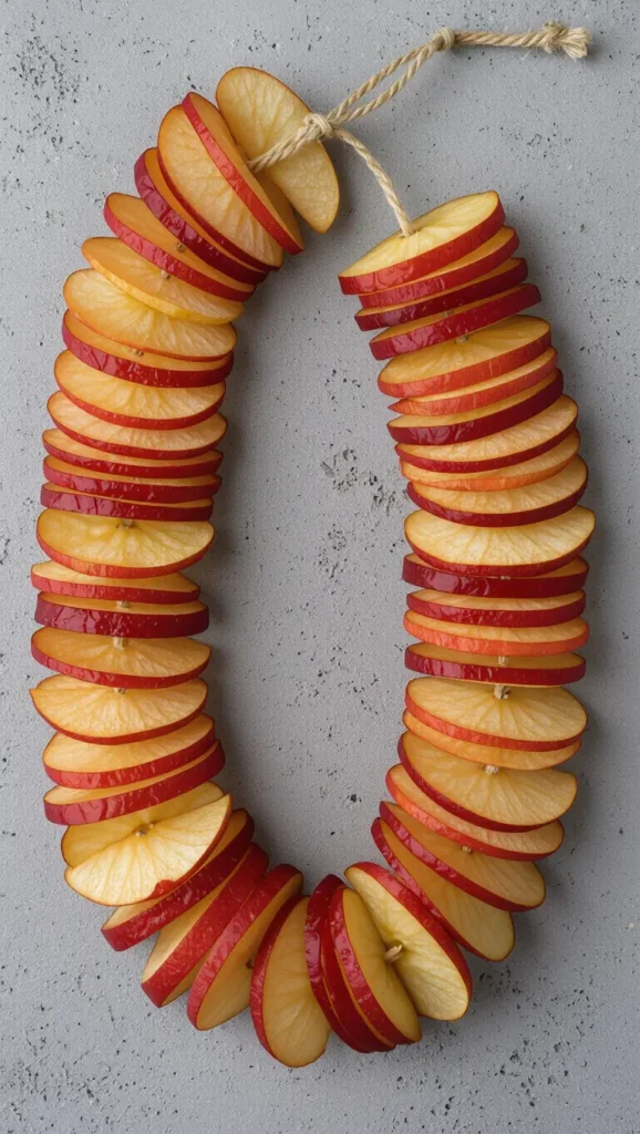 String dried apple slices to form a soft, rustic garland. Their subtle scent and translucent glow add a cozy, pastoral feel to winter décor.