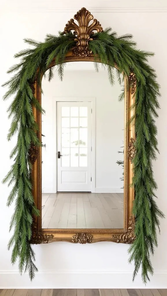 Frame an ornate mirror with thick evergreen garlands. The greenery enhances the reflection and creates a lush, eye-catching focal point.
