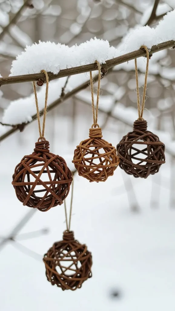 Tie small twigs together into simple stars or diamond shapes. Hang them on your tree or branches for a minimalist ornament that perfectly celebrates nature.