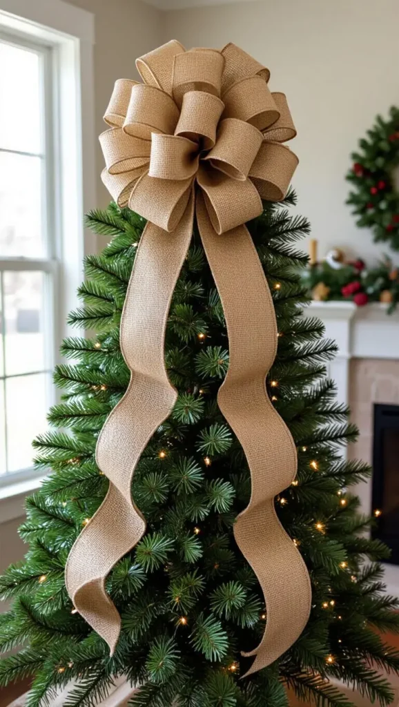 Replace glittery toppers with a dramatic burlap ribbon bow. The natural texture adds height, softness, and rustic elegance to your tree—no sparkle required.