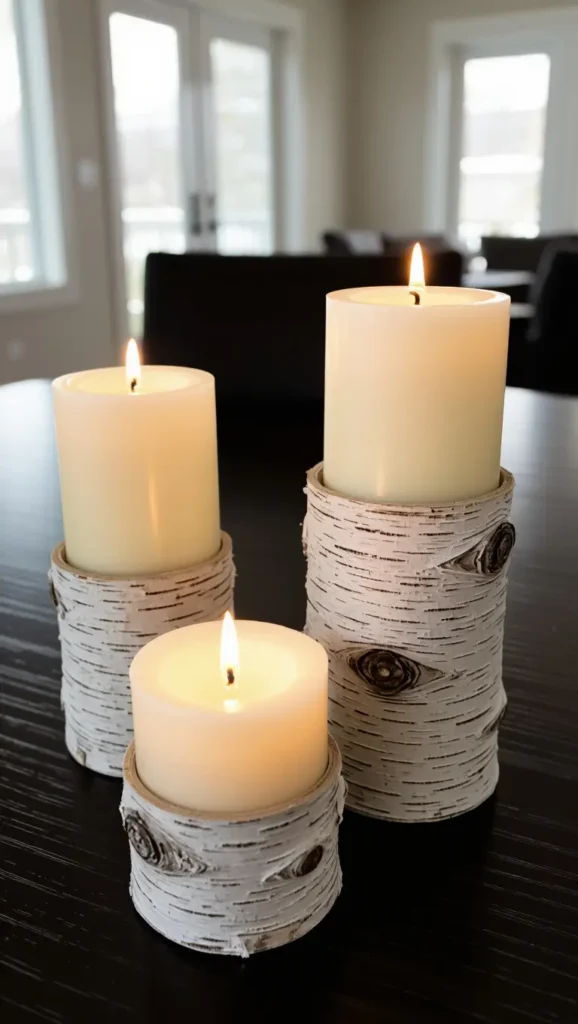 Wrap pillar candles with birch bark and secure with twine. Display them on dark wood surfaces for striking contrast and warm, flickering light that brings the outdoors in.