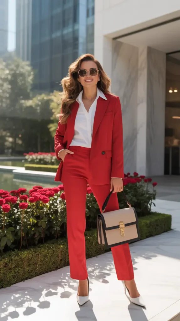 A sharply tailored red suit is pure confidence. Balanced with a crisp white shirt and neutral accessories, it feels powerful without being overwhelming.