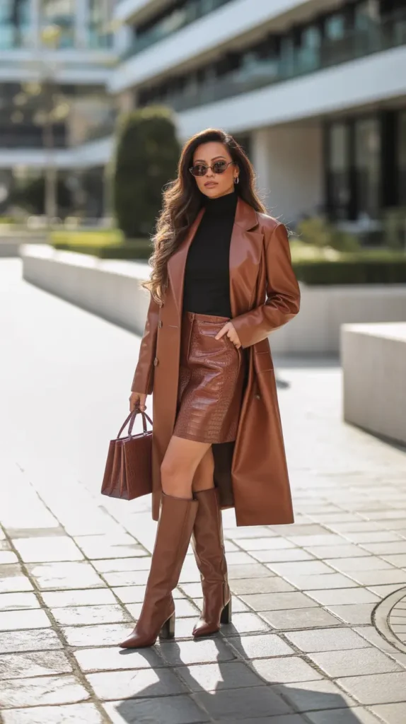 A tonal brown look featuring a long leather coat, pleated mini skirt, and knee-high boots feels luxurious and grounded. A black turtleneck adds contrast and seasonal polish.